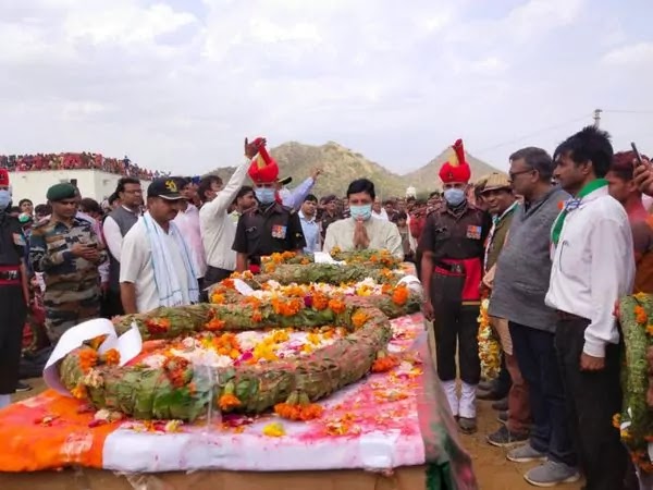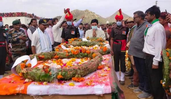 The body of Naib Subedar Naresh Kumar Sharma reached Mankasas village on Friday when Hazare Laageen's eyes became moist. Naib Subedar Naresh Kumar Sharma of Jhunjhunu Mankasas was cremated with state honors on Friday. Whose four-year-old son Mayank lit the pyre. Langley gave a final farewell to the patriotic slogans of Ladle.